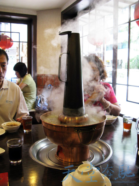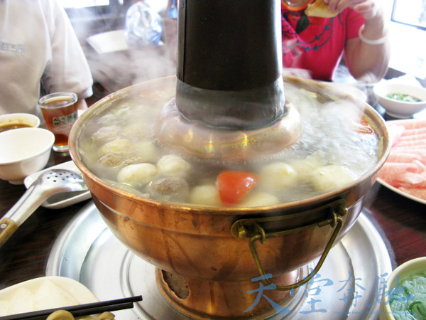 火鍋上桌。我對這種有煙囪的銅質火鍋其實很有感情,小時候家裡也有隻銅質手工火鍋,每次家裡吃火鍋就看那煙囪一根黑黑的很有趣,冬天時看火鍋蒸氣像薄雾般煖煖升起,整個廚房飯桌都是火鍋的高湯底香味,還要再底座添加炭火,很是懷念。