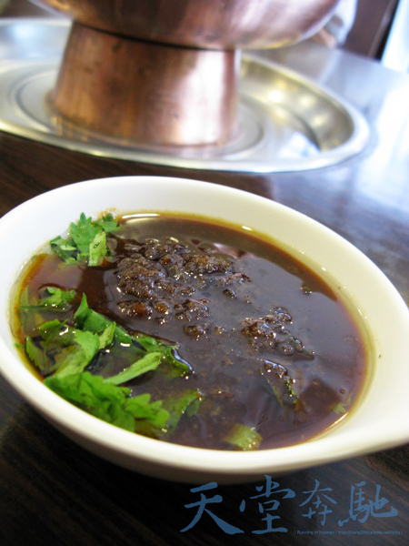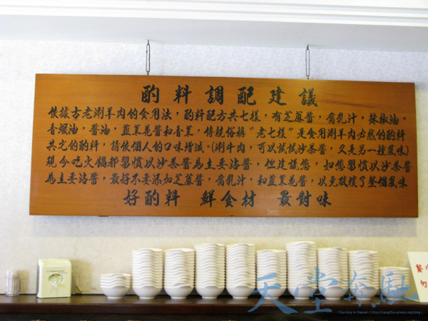 店內空間算是滿寬敞舒適的,各桌間的走道動線寬敞不擁擠。醬料區可看出老闆也很用心的在經營。酌料區上頭掛了個匾額寫明了老七樣包含芝麻、腐乳汁、辣椒油、醬油、香蝦、韭菜花醬及香菜,可以按照它的建議或是依個人喜好來取酌料都無妨,如愛吃沙茶口味也有使用建議。